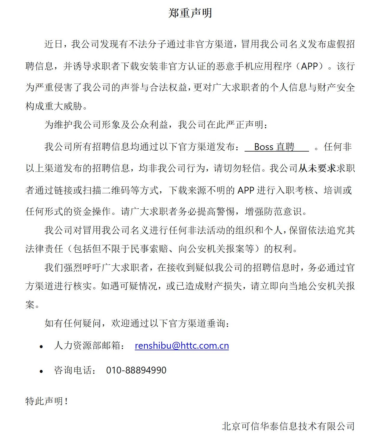 六险一金 绩效资金 餐补 带薪年假 定期体检 免费班车 弹性打卡 员工活动简历投递 : pengxingwei@httc.com.cn