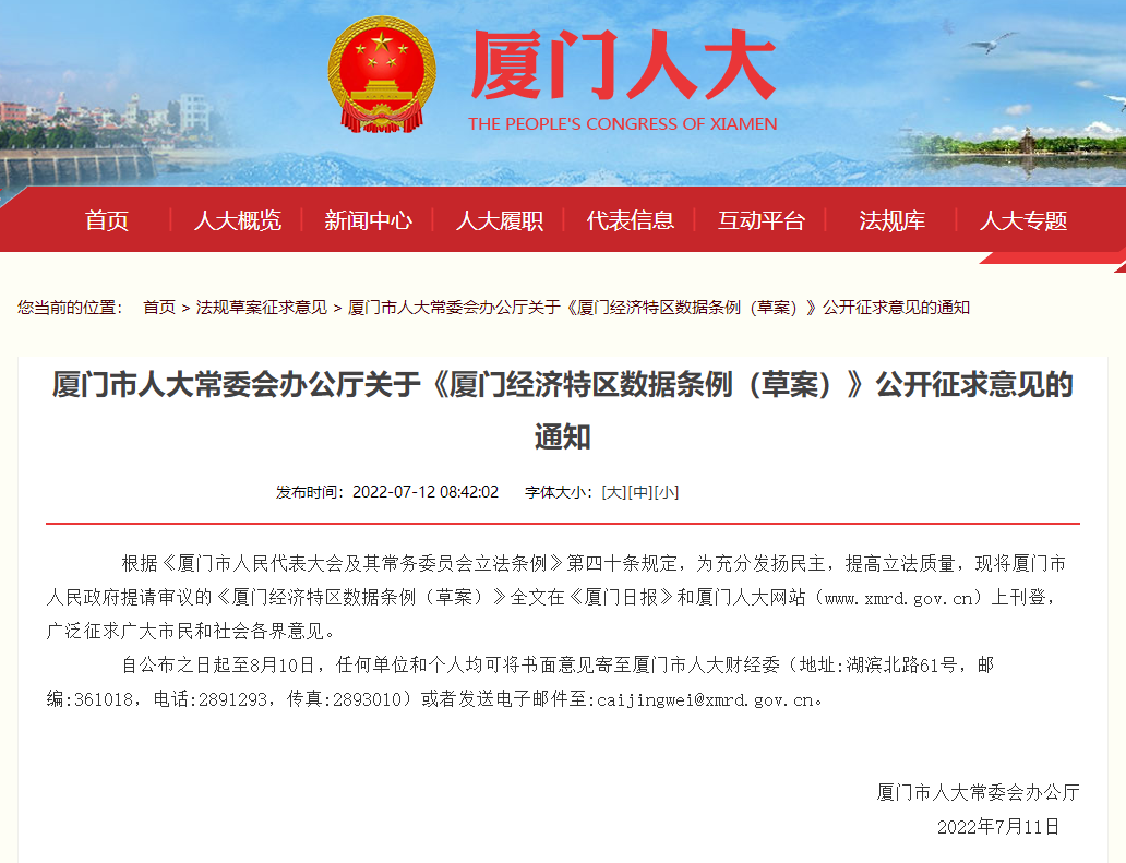 - ● 厦门市人大常委会办公厅关于《厦门经济特区数据条例 (草案)》公开征求意见的通知