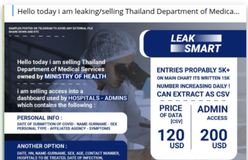 据悉,网络犯罪分子从泰国医学科学部窃取了 PII 数据,这些数据包含有关新冠的信息。这些数据在几个暗网市场上出售,并可通过不良行为者创建的 Telegram 频道进一步购买。根据获得的样本和与安全事件相关的分析发现,不良行为者能够未经授权访问政府门户,从而非法管理用户和记录,并窃取敏感和个人信息,包括但不限于姓名、性别、年龄、联系方式、病史和相关的当地医疗保健标识。