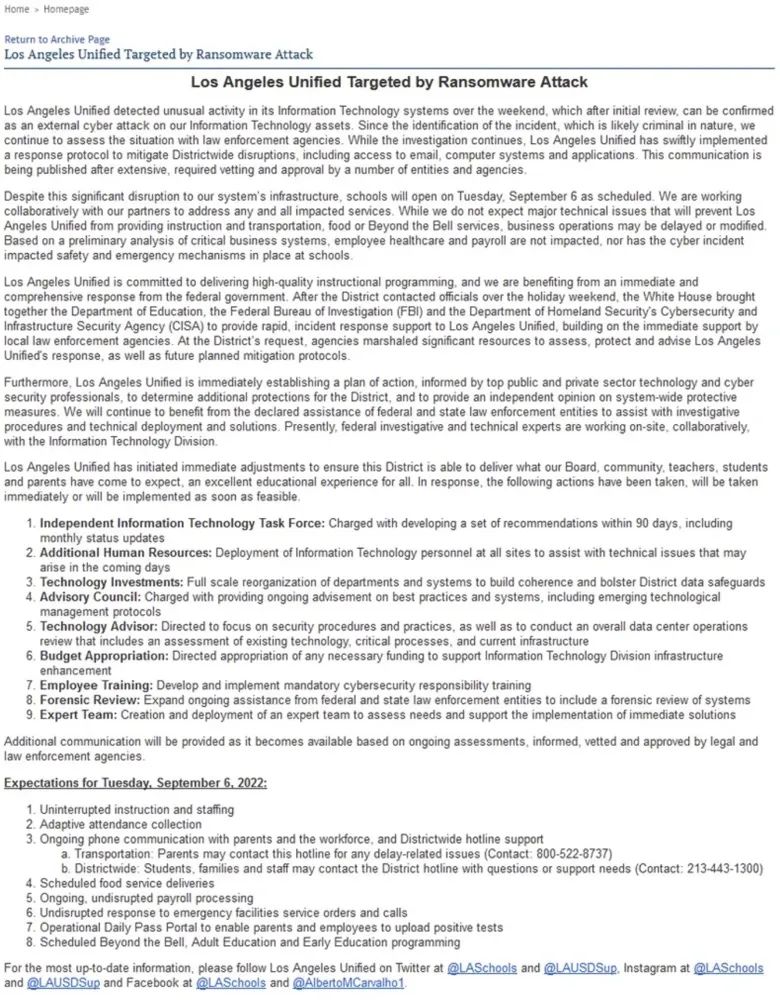 洛杉矶联合学区 (LAUSD)承认遭到勒索软件攻击,随后确认攻击类型为勒索软件,导致 LAUSD 基础设施出现“明显的中断”,包括“访问电子邮件、计算机系统和应用程序”,不过该学区表示正着手恢复受影响的服务。预计技术问题不会影响交通、食品或课后活动,但指出“业务运营可能会延迟或修改”。