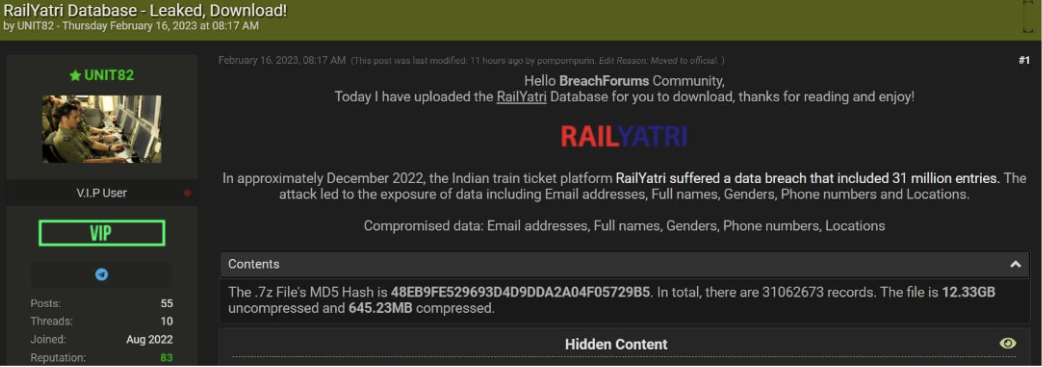 印度流行的火车票预订平台RailYatri遭遇大规模数据泄露,暴露了超过 3100 万 (31,062,673) 名用户/旅客的个人信息。据信,敏感信息数据库现已在线泄露。泄露的数据包括电子邮件地址、全名、性别、电话号码和位置,这可能使数百万用户面临身份盗用、网络钓鱼攻击和其他网络犯罪的风险。