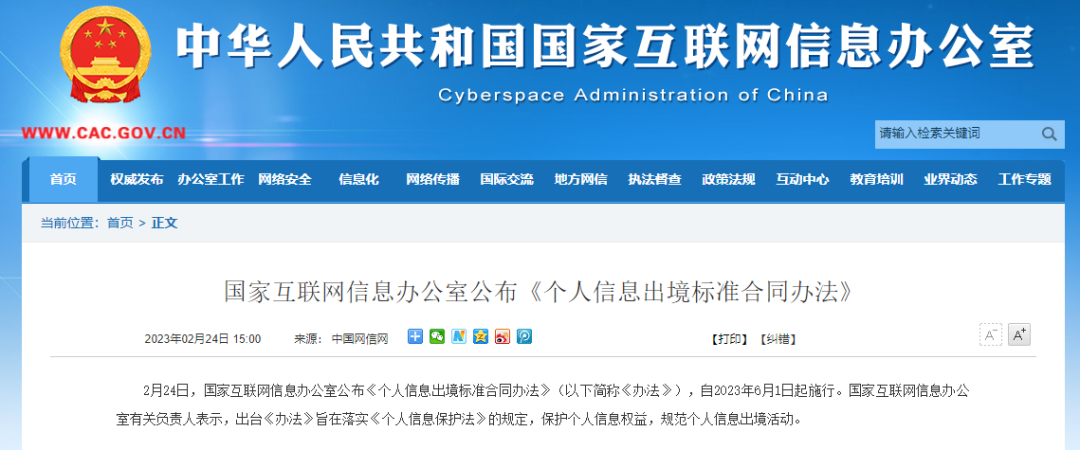 ● 国家互联网信息办公室公布《个人信息出境标准合同办法》