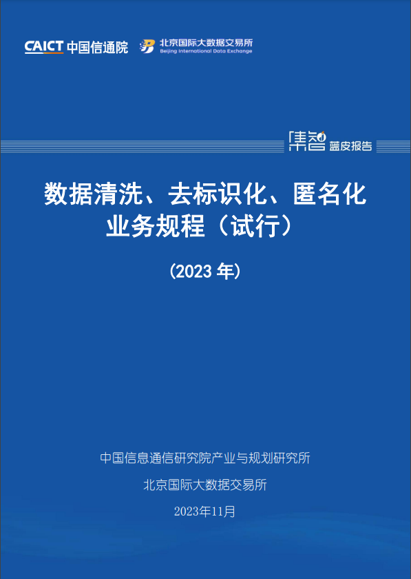 为规范数据处理行为,激活数据要素市场,北京市经济和信息化局指导中国信息通信研究院产业与规划研究所、北京国际大数据交易所联合编制、发布国内首个数据清洗、去标识化、匿名化处理相关流程方法的业务规程——《数据清洗、去标识化、匿名化业务规程(试行)》,旨在指导行业主体组织开展数据清洗、去标识化、匿名化处理等及相应的技术测试评估,支撑数据共享、交易、开放等流通活动合规、有序进行。规范数据清洗、去标识化、匿名化处理等业务活动,有助于提升数据的可用、可信、可流通、可追溯水平,推动数据要素强化优质供给,是促进数据要素化和要素市场化的必经步骤。