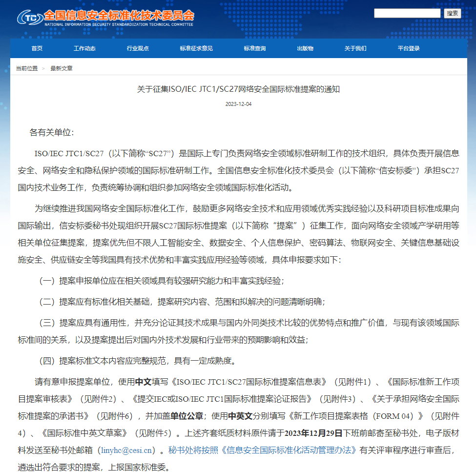 ● 全国信安标委公开征集ISO/IEC JTC1/SC27网络安全国际标准提案