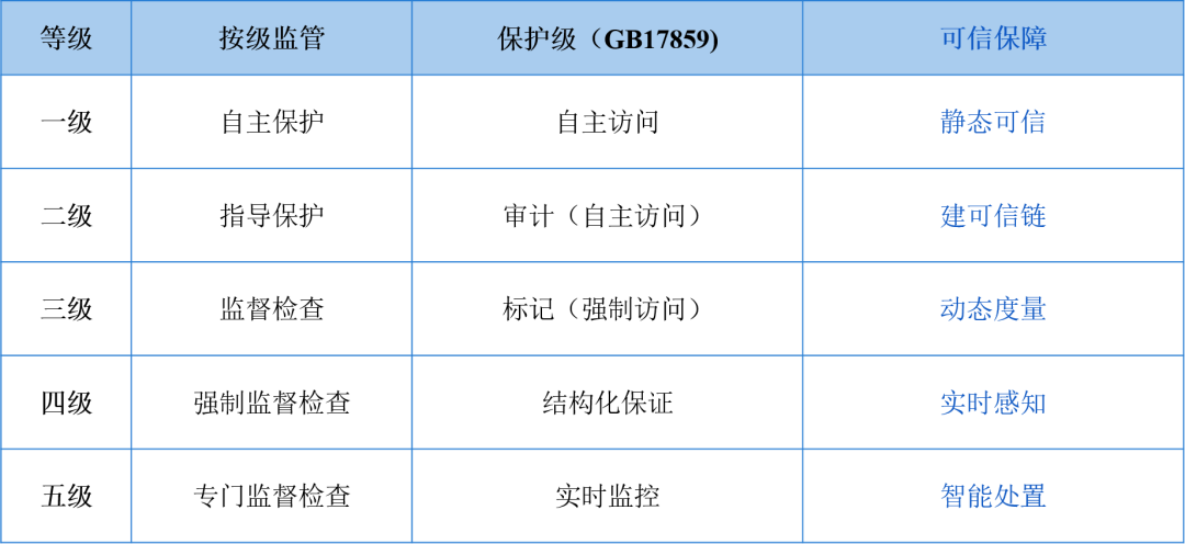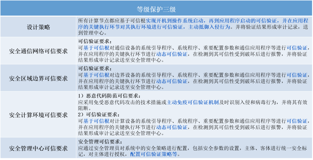 等级保护四级:信任链传递到动态度量阶段,在等级保护三级可信要求的基础上,将可信验证的范围扩展到应用程序的所有执行环节,并对可信验证结果进行动态关联感知,以及在检测到其可信性收到破坏时采取措施恢复。